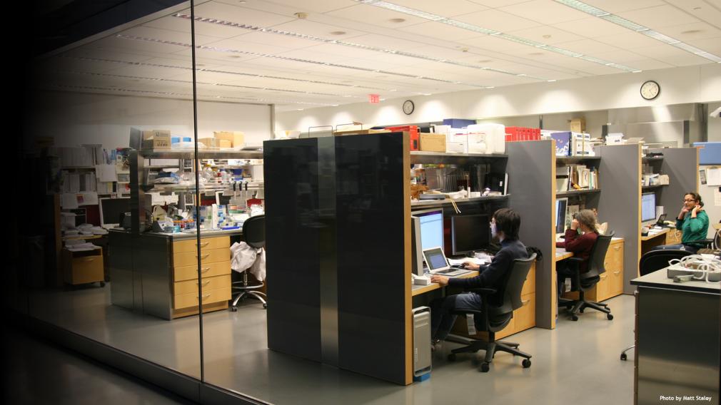 Our flexible lab spaces are adapted for each project’s needs, whether room for hands-on science or theoretical research. Scientists access world-class support facilities behind the labs. Vibration-resistant and climate-controlled areas house sensitive equipment. Shared research resources include a vivarium, an advanced imaging center, a high-performance computer cluster, and an instrument design and fabrication shop.