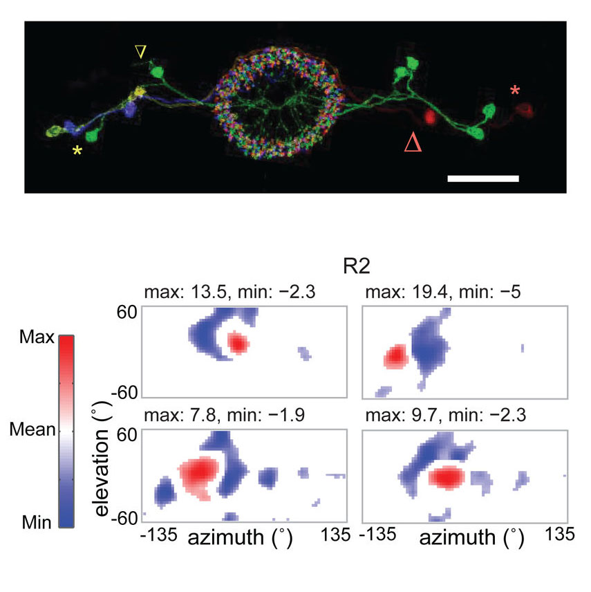 View Publication PageMany animals, including insects, are known to use visual landmarks to orient in their environment. In Drosophila melanogaster, behavioural genetics studies have identified a higher brain structure called the central complex as being required for the fly’s innate responses to vertical visual features and its short- and long-term memory for visual patterns. But whether and how neurons of the fly central complex represent visual features are unknown. Here we use two-photon calcium imaging in head-fixed walking and flying flies to probe visuomotor responses of ring neurons—a class of central complex neurons that have been implicated in landmark-driven spatial memory in walking flies and memory for visual patterns in tethered flying flies. We show that dendrites of ring neurons are visually responsive and arranged retinotopically. Ring neuron receptive fields comprise both excitatory and inhibitory subfields, resembling those of simple cells in the mammalian primary visual cortex. Ring neurons show strong and, in some cases, direction-selective orientation tuning, with a notable preference for vertically oriented features similar to those that evoke innate responses in flies. Visual responses were diminished during flight, but, in contrast with the hypothesized role of the central complex in the control of locomotion, not modulated during walking. Taken together, these results indicate that ring neurons represent behaviourally relevant visual features in the fly’s environment, enabling downstream central complex circuits to produce appropriate motor commands. More broadly, this study opens the door to mechanistic investigations of circuit computations underlying visually guided action selection in the Drosophila central complex.