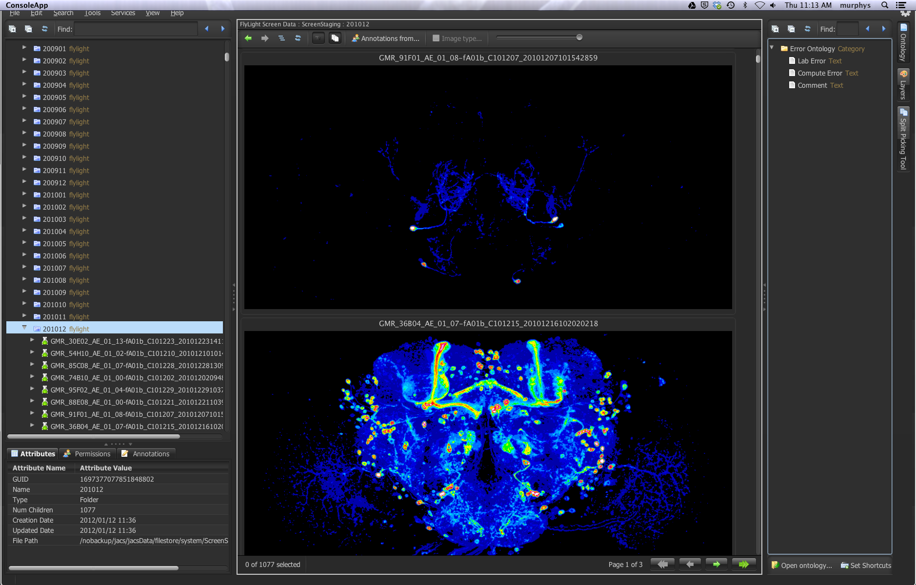 The Janelia Workstation is a discovery platform used to analyze and annotate imagery for individual projects, while assembling shared data resources such as neuron atlases. It was originally applied to Drosophila neuronal anatomy and neuroblast lineage analysis and is currently being extended to support mouse whole-brain projection tracing. The Workstation is both a pipeline management system that extracts entities from 3D imagery and a suite of tools that enable scientists to annotate large imagery datasets. The kernel of the design is an Entity-Attribute-Value (EAV) graph permitting any element to be annotated by users with custom ontologies. Currently there are ~30 million entities in the graph, with ~700,000 manual annotations. By allowing any entity to have multiple parents, the graph can be re-arranged by each user to suit their research needs without copying the underlying image data.