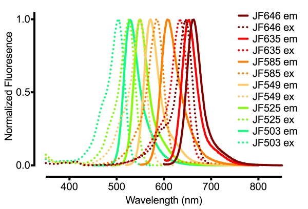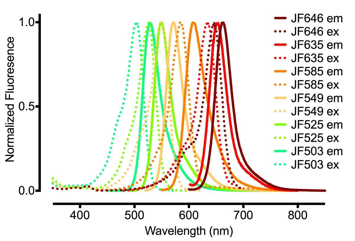 - JF646: The standard far-red excited fluorophore ideal for deep imaging with minimal background fluorescence.
