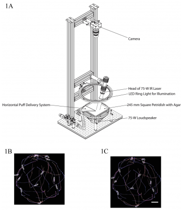 Diagram of a tracking system developed by the Zlatic lab with stimulus modules for automated delivery of air puffs, sound and pain. Figures 1B and 1C show examples of the automated tracking of larvae behavior with Multi Worm Tracker software.