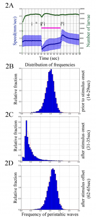 - Prior to the project launch, the basic assay platforms were developed in Dr. Zlatic’s laboratory. Tomoko Oyama in the Zlatic lab has so far tested 600 GAL4 lines in the vibration assay and found that 6% were significantly different in their head casting and turning in response to vibration (while the baseline turning rate was normal). As larvae were monitored before delivering a stimulus, lines that were significantly different from controls during their baseline (pre-stimulus) behavior were also detected. For example, 12% of the lines were significantly different from controls in their baseline frequency of peristaltic waves.